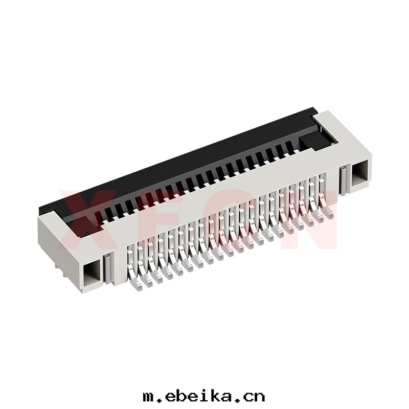 描述:FPC-0.5mm間(jiān)距,卧貼掀蓋式下(xià)接觸,20位,高(gāo)度(dù)1.5mm